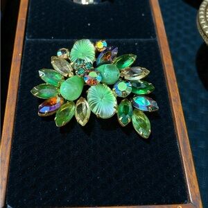 This VERIFIED JULIANA D&E brooch has light green green pillowcase stones, striped molded glass drop accents, and faceted citrine, green, and AB rhinestones.