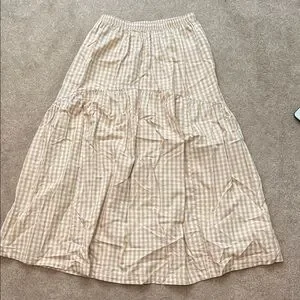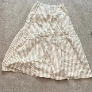 Chic cream gingham design. White and cream gingham. Flowy and stylish. Ideal for versatile wear. Midi length, 100% cotton. Elastic waist and pockets.
