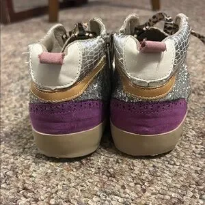Shimmering silver glitter design. Features purple and black accents. Leopard print laces add flair. Perfect for a stylish look.