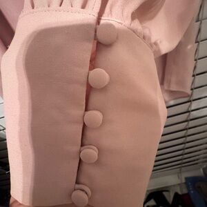 Blush top featuring delicate lace accents. Ideal for elegant occasions.