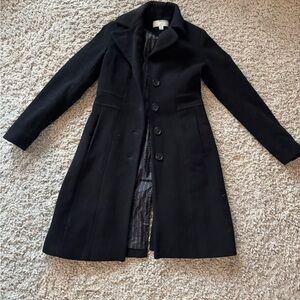 Sophisticated black trench coat by Anne Klein. Timeless design with button closure. Ideal for versatile styling.