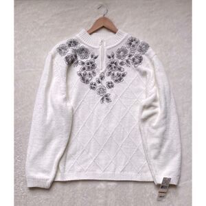 NWT Alfred Dunner Glacier Lake Pullover Half Zip Embroidered Sweater in Ivory
