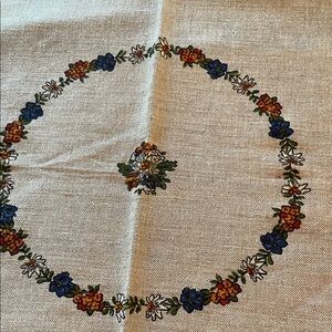 Charming tablecloth featuring folk art designs. Green border adds a classic touch.