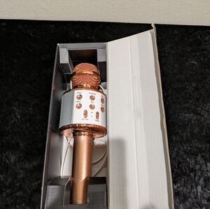 Stylish pink wireless microphone with colorful LED lights. Perfect for karaoke and parties.