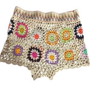Vibrant crochet shorts featuring a multicolor design. Perfect for a stylish and comfortable look. Waist measurement is 13 1/2 inches. It stretches to 19 inches or 38 inches around. The hips are 18 inches. They stretch to 23 inches or 46 inches around. The length is 12 inches.
