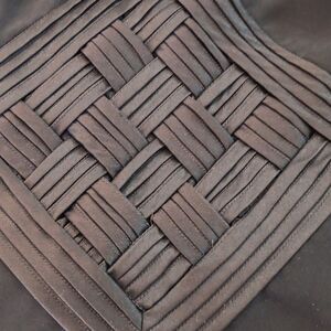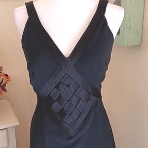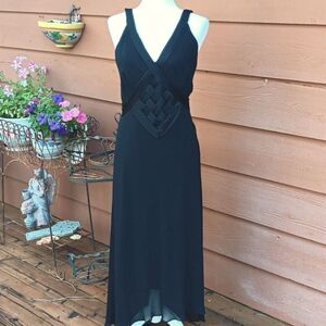 This dress speaks Old Hollywood and glamour. The bodice has a woven satin embellished front and tucked satin trim on front and straps. Semisheer overlay, slightly longer in back. Side zip. Size 14 measures 40 at chest, 30 at waist, 44 at hips, 52 long in front and 57 long in back. Beautiful, elegant and timeless.