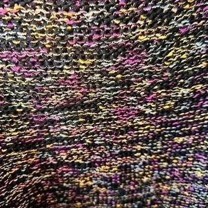 Beautiful multicolor on black. Somewhat silky feel great spring /summer weight and professional too! 70% nylon, 30 % acrylic.