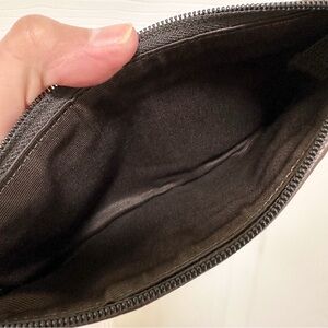 • Features: Zip-top closure, detachable wrist strap, silver-tone hardware