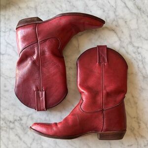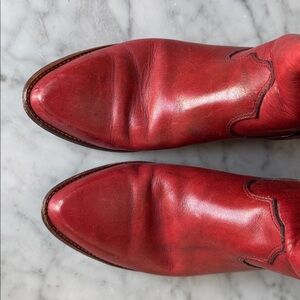 Frye 100% leather red cowboy boots. shaft of boot is 10” tall from sole of boot. neck of boot is 6.5” in diameter.