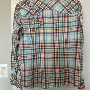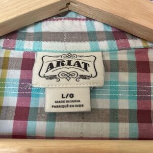 The Ariat Women's M Pink Blue Plaid Fitted Ariat Western Cowgirl Snap Shirt is a stylish and versatile addition to any wardrobe. Made from 100% cotton, this button-up shirt features a classic/fitted sleeve and a collared neckline, perfect for the cowgirl character. The multicolor plaid design with accents of rhinestones and embroidery detailing adds a touch of Western flair. Ideal for various occasions like weddings, parties, or casual wear, this lightweight shirt is machine washable and suitable for all seasons. The slim fit and basic style make it a flattering and comfortable choice for any cowgirl looking to add a pop of color to her outfit. Chest measures 22”.