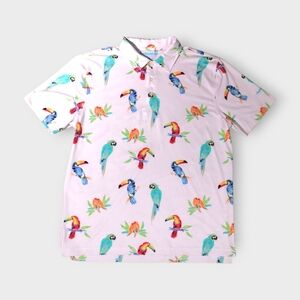 The Chubbies The Birds Of Polodise Performance Polo Shirt in size Medium features a fun and colorful design with a parrot and toucan theme. Made of comfortable fabric and crafted with a regular fit, this polo shirt is perfect for men who want to add a touch of bird-themed flair to their wardrobe. The white background and multicolor bird motifs make this shirt a stylish and unique choice for any casual or semi-formal occasion.