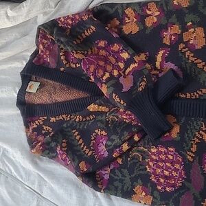 Stay cozy and stylish with this floral patterned sweater cardigan. Featuring vibrant colors, it's perfect for adding a pop of color to your wardrobe.
