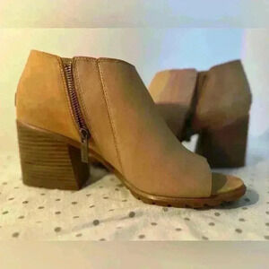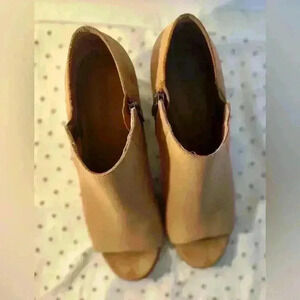 Rich tan upper with slight contrasting detail on side. Very cute shoes with loads of classy vibe and chic looks. Leather. Comfortable, lug sole styling. Nice height and peep tie. Side zip with elastic gore.