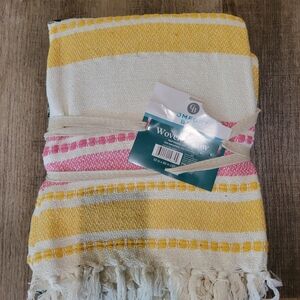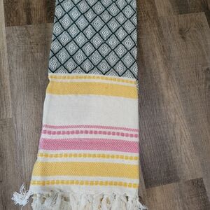 Stylish throw blanket with a geometric pattern. Features green, yellow, pink, and white colors. Perfect for adding a pop of color to any room.