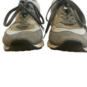 This pair of Sage green and light pink suede casual sneaker shoes are by New Balance. The lace up tennis shoes are a women’s size 10. They are in overall nice preowned condition with lots of wear left.