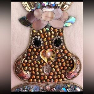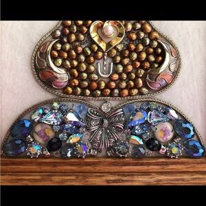 Easter Rabbit Framed Jewelry Art Home Decor with vintage jewelry in recycled frame, Easter Decor, Rabbit Art, Easter Hostess Gift, Bunny. This creation is made with vintage and recycled jewelry and is mounted in 8”x6”x.50” wooden recycled frame. Made by Grandmajosworkshop. The product is a vintage jewelry art piece featuring an Easter rabbit. It falls under the theme of art and the subject of a rabbit. It is a unique mixed media art and collage art creation that showcases the intricate beauty of jewelry in a creative and artistic way.