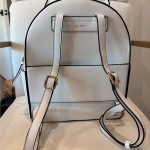 Elegant Calpak backpack in cream with bold black stitching. Ideal for daily adventures. See second picture for wear on faux leather near top. Not super noticeable, reflected in price. Clean interior with no marks or flaws.