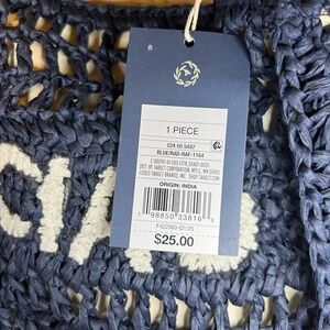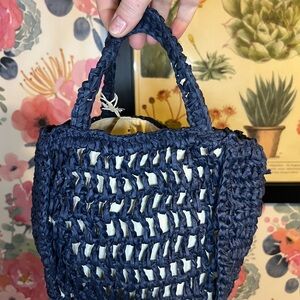 Navy blue woven mini tote bag with 'CIAO' written in off white/cream. Perfect for casual outings,, or that one particular outfit or event. Has crossbody strap option as well. Can fit a lot more than you think in this purse.