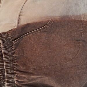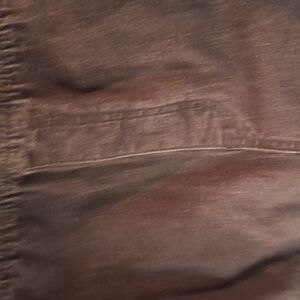 Slightly distressed brown jeans with elastic waist and faux fly. Perfect for everyday wear. Ideal for a relaxed and casual look. There are 2 U-shaped pockets in the front and 2 patch pockets in the back. 96% Cotton and 4% spandex. Machine wash wash, tumble dry low.