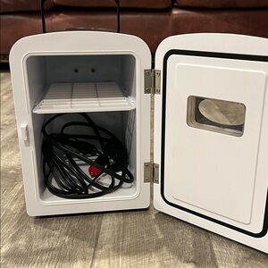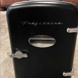 Frigidaire vintage look counter top mini fridge. Perfect for office or makeup counter. Use for beauty products or drinks/snacks. Comes with traditional plug and plug for car. Shelf is removable