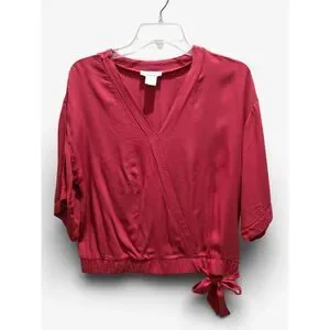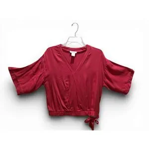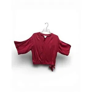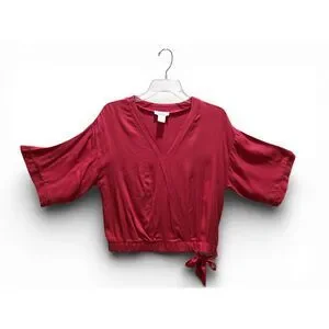 Women’s Burgundy Wrap Front Top | Short Sleeve Tie Waist Blouse | Medium