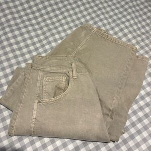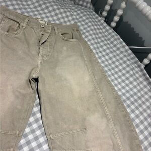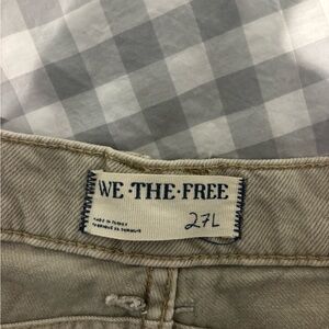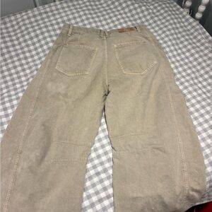Free People barrel jeans, khaki color, size 27 long, great for tall women, some discolor visible in photos, loved but with plenty of life left!