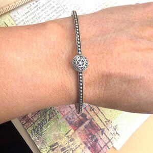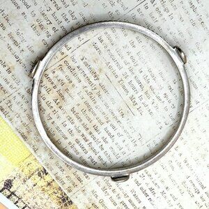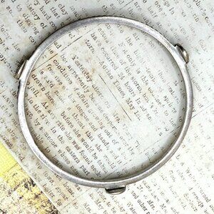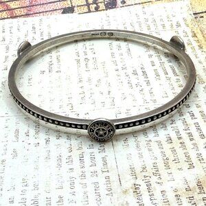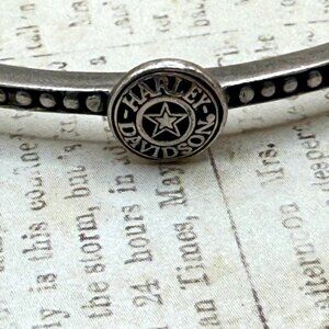 Lovely preloved estate silver Harley Davidson branded bangle bracelet. No hallmarks found for metal content. See all markings. Silver, studded with three round Harley logos. Looks fabulous. Stackable with other bracelets. Shows some darkening and signs of age. Smoke free. Fast and secure shipping. Authentic Harley Davidson jewelry. Great for motorcycle, riding enthusiasts.