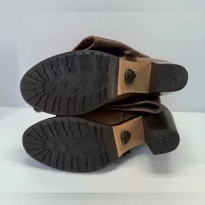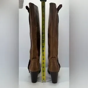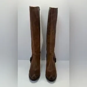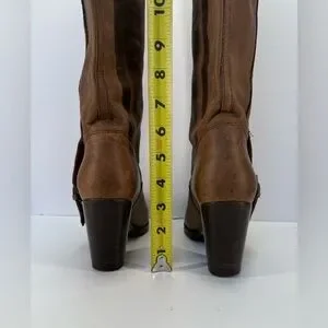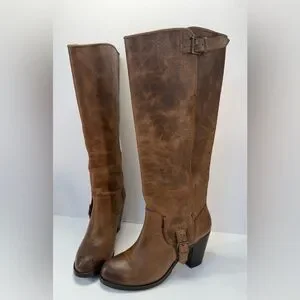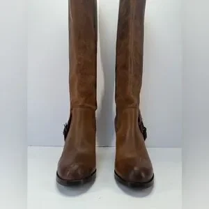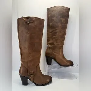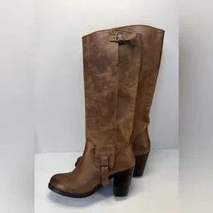 Elegant brown leather boots with buckle accents. Perfect for any occasion. Ariat Gold Coast Crushed stone Leather casual country boot, knee high, distressed, women’s size 8 B. In great preloved condition. Some minor scuffs, adds to the distressed look