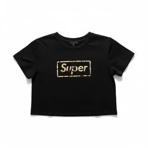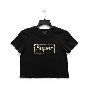 Stylish and trendy teen girls graphic crop top featuring a bold “Super” logo on the front. This black short-sleeve tee has a cropped silhouette, making it perfect for casual streetwear looks or layering with high-waisted jeans, joggers, or skirts.