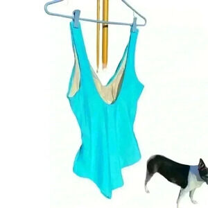 Crossover ruched neckline flatters, while a soft-cup shelf bra offers and front lining offer comfy support. Deep scoop back and full-coverage bottom. SLIMMING but comfortable suit in a GORGEOUS Tiffany blue! I took pics in full sun and shade so you can see the color difference. Size 10 bathing suit size. Clean as whistle, no odor, smoke free home and free of stains. Poly/spandex; nylon/spandex/poly lining. Machine wash.