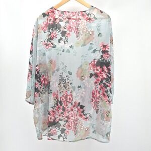 Drape yourself in a cascade of vibrant blooms with this exquisite floral print kimono. Its airy, sheer fabric floats gracefully, offering a touch of ethereal beauty to any ensemble. Delicate pinks, corals, and subtle greens mingle with deep charcoal accents against a soft, light blue backdrop, creating a mesmerizing botanical garden you can wear. The open-front design and relaxed silhouette invite effortless layering, adding a touch of bohemian charm and sophisticated flair. Perfect for adding a splash of color to a beach vacation, elevating a casual day out, or bringing a touch of artistic elegance to an evening gathering.