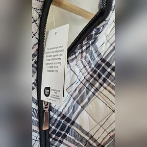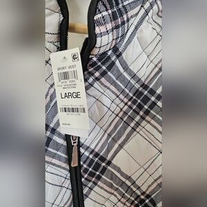 A classic layer for any casual look, this petite puffer vest from Karen Scott features a plaid print and two side pockets.