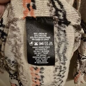 Women's NIC+ZOE long-sleeved blouse in size medium. Features a sheer, lightweight fabric with an abstract geometric pattern in cream, black, coral, and taupe tones. Stylish and breathable—perfect for layering or wearing on its own. Gently used and in great condition.