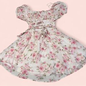 Puff sleeve white and pink floral open tie back midi dress from blu pepper in a size L but could fit an M. Similar to Liz Lisa, Axes femme, Ank rouge, angelic pretty