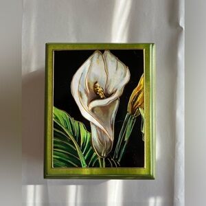 Gorgeous Hand Painted Calla Lily Green Wooden Trinket Box EUC