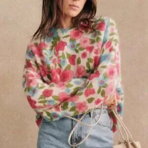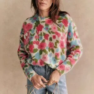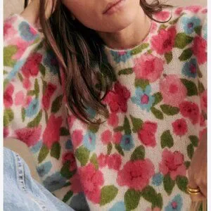 Sezane Janelia Jumper Sweater - Pink Flowers/ Turquoise Kid Mohair Knit French