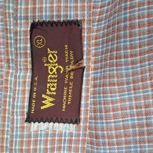 Vintage Wrangler brown & blue plaid casual button-down western style short sleeved shirt is in good shape with normal vintage wear. Spot on the back that has been pictured. No hole's no missing buttons, no loose threads.