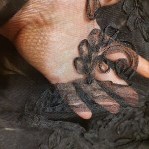 ▪️Onyx Black Sheer Mesh Tulle Organza with Hand Sewn Scrolling Floral Ribbon Pattern Throughout