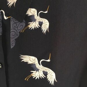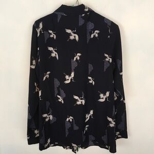 Chic navy button down blouse with elegant crane design. Perfect for versatile styling. Fresh from the drycleaner. Excellent condition. Smoke free, pet free home