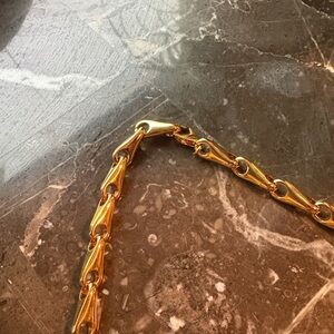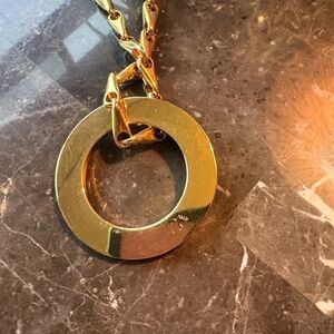 Bold Celine necklace with a gold chain and green circular pendant. Distinctive design with Celine logo.
