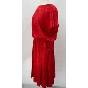 Vintage 80s Brocade Dress Embossed Floral Pattern Blouson Pleated Red