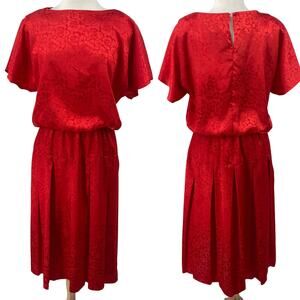 Vintage 80s Brocade Midi Dress Embossed Floral Pattern Blouson Pleated Red 10
