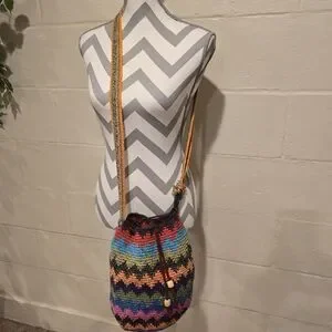 Crochet Bag Colorful Drawstring Bucket Hippie Boho Festival Travel Handmade Knit