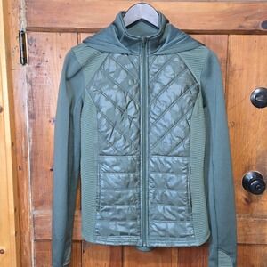 Keywords: Tek Gear, women's jacket, olive green, quilted, camouflage, full zip, hoodie, athletic, activewear, casual, outdoor, layering, sporty, fall fashion