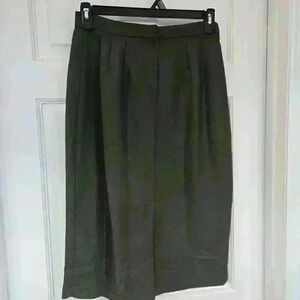 This Clio suit in olive green is a timeless piece that will never go out of style. The jacket is long in length with a classic fit, and the skirt is a size 12 with a solid pattern. The set includes both the skirt and jacket, making it perfect for any formal, workwear, or business occasion.