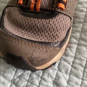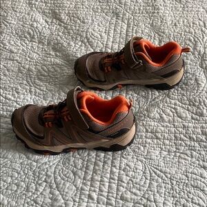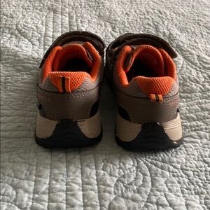 Experience the perfect blend of style and functionality with these Merrell sneakers, featuring a durable brown upper and vibrant orange accents. Designed for outdoor adventures, they offer a thick, textured sole for excellent traction and easy-to-use velcro straps for convenience. The sporty design ensures both comfort and a lively appearance. And when they get too dirty, just throw them in the washer!