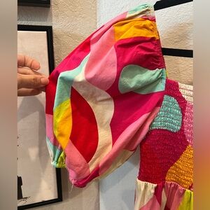 The FLYING TOMATO Sweet Dreams Pink Abstract Mini Babydoll Dress in Size Small is an abstract patterned, short sleeve dress with a smocked neckline and bodice. Made of cotton, it features ruffle accents and a short dress length, perfect for casual occasions during the summer and spring seasons. Also can be worn off of the shoulders!!! Shoulder to hem- 31”