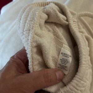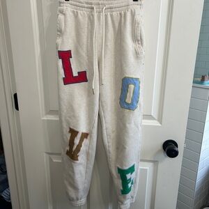 Aerie size XS women’s cream sweatpants feature vibrant letter patches spelling LOVE in bright colors. Fit like a Small. Also fit size 14/16 girls and are perfect for preteens.