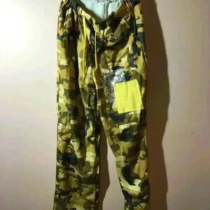 Large Bright Yellow T Shirt with Camoflauge Pants Set, Shirt is short sleeved, cropped at the waist, Front is shorter than the back, , Pants are Camo with Yellow drawstring elastic waist, Rolled up Cuffed bottom Legs, Silver/Yellow Patchwork on Left Thigh of Pants, Pants are sweatpant material. Very comfy outfit