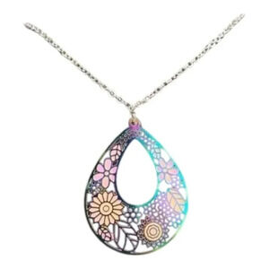 This is an absolutely stunning metal alloy filigree style floral teardrop necklace with Flower earrings. These are simply stunning and change depending on how the lights hit them. They are multi-colored with a multitude of rainbow colors mostly focused on the blues, purples, and greens. It is reminiscent of an oil slick. These are a super lightweight and delicate earring that are going to be more comfortable wearing all day. Each order comes with its own jewelry box which is then wrapped in extra bubble wrap.
